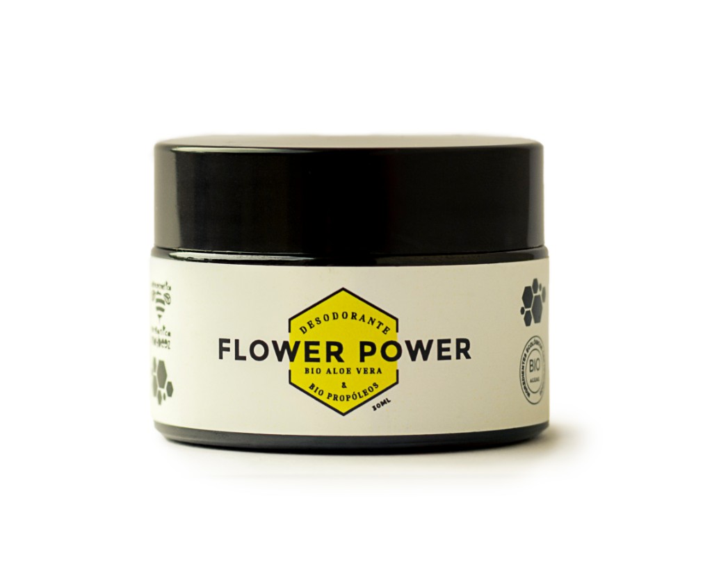 Bicarbonato de sodio – un ingrediente de origen mineral que funciona estupendamente como inhibidor de olores desagradables. Propóleos ecológico procedente de nuestra producción apícola es otro agente desodorante además de ser ampliamente conocido por sus propiedades antibacterianas. Óxido de zinc es un compuesto mineral antiséptico y astringente que también tiene efecto desodorante en la piel. Gel de Aloe Vera ecológico de nuestro cultivo y elaboración neutraliza los olores sin obstaculizar transpiración de la piel calmándola a la vez. Almidón de arrurruz se extrae de los rizomas de la planta llamada “maranta”. Este ingrediente actúa absorbiendo humedad – uno de los efectos del proceso de la transpiración cutánea. Manteca de Karité ecológica y aceite de coco ecológico tienen función de hidratar la piel dándole una consistencia cremosa a nuestro desodorante. Los aceites esenciales ecológicos de lavanda, salvia, geranio y patchouli son aceites antisudoríficos, astringentes, antisépticos además de poseer aromas fuertes ideales para un desodorante natural como el “Flower Power”.