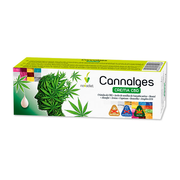 Cannalges Crema CBD de Novadiet, es una crema balsámica formulada con cristales de CBD, aceite de semillas de cannabis sativa, alcanfor, mentol, jengibre y árnica que ayuda a mitigar el dolor.