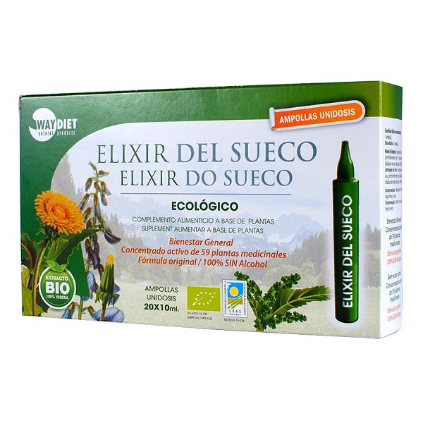 El “Elixir del Sueco” de WAY DIET viene a suplir la falta de productos amargos en nuestra alimentación y, por lo tanto, a combatir el desequilibrio metabólico que origina la carencia de dichos amargos. El “Elixir del Sueco” WAY DIET contiene 59 plantas medicinales, usadas tradicionalmente, con un amplio espectro de acción sobre diferentes órganos, aportando salud al organismo. Estas plantas las podemos asociar por sus propiedades en diferentes grupos de actividad: